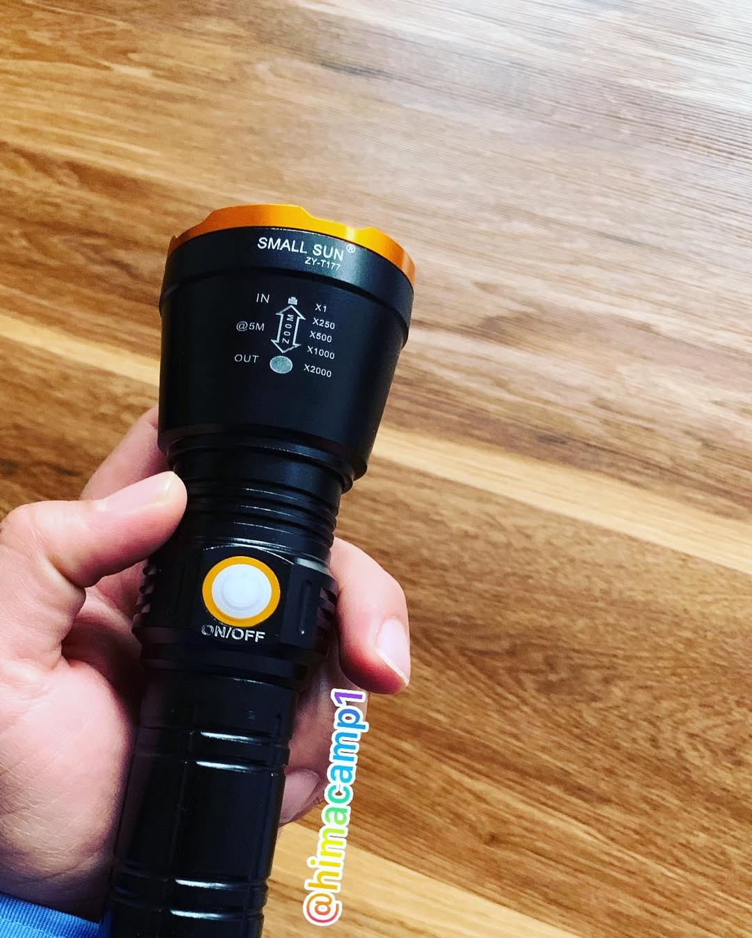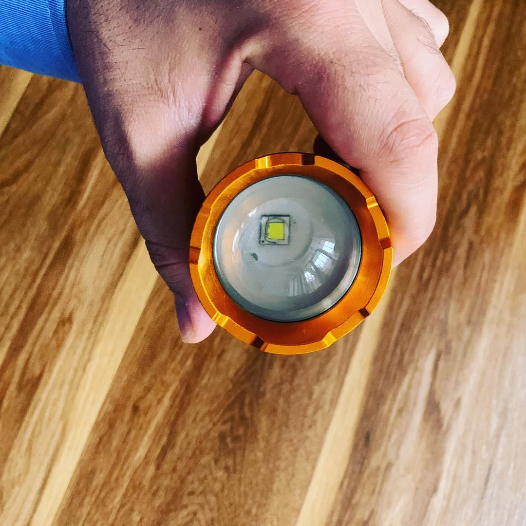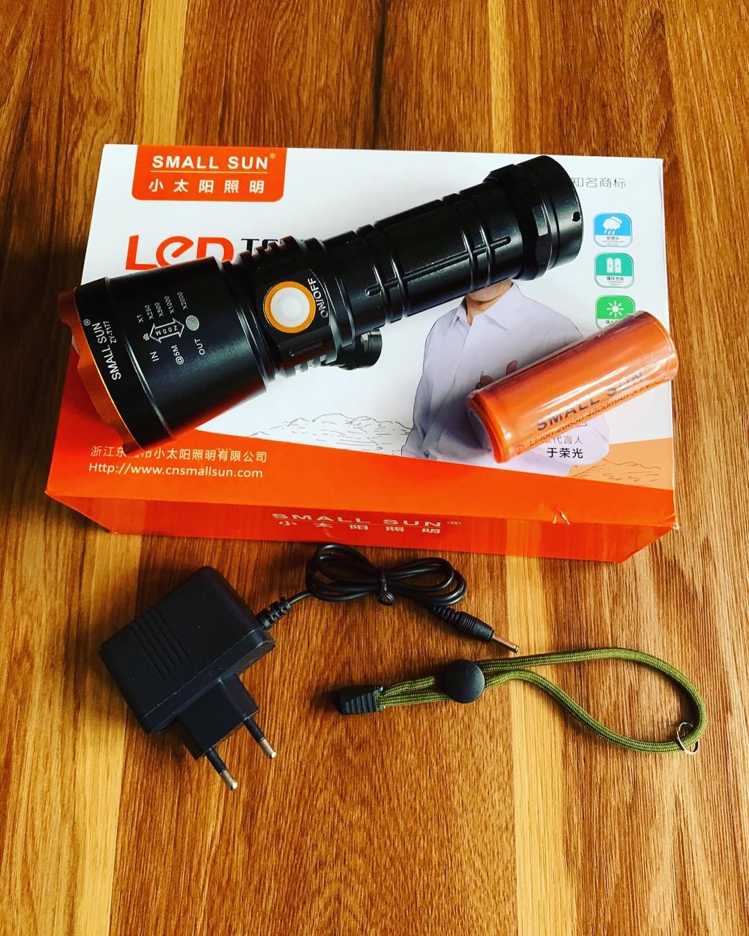 چراغ قوه اسمال سان با جنس بدنه آلومینیوم و وزن ۴۵۰ گرم دارای ۳ حالت نوردهی با قابلیت تنظیم نور، یک عدد شارژر دو شاخه ای و بند نگهدارنده.